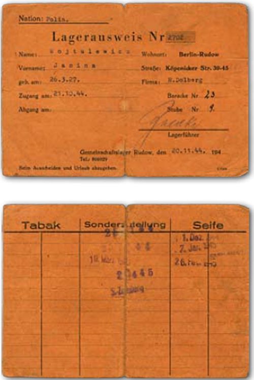 “camp pass”. Type of document issued for the workers deported to Germany to special camps – Gemeischaftlager. The card from the camp included not only the identification information about their workplace but also on the back, their allocation of tobacco (Tabak), soap (Seife) and “special allocations” – Sonderzuteilung. The camp was often monitored by a person delegated by the German Labor Front – Deutsche Arbeits Front (DAF), which held a number of police functions. These barracks labor camps were located in large industrial areas or in urban centers. The camps were usually placed in unused public or industrial buildings. This could be old dance halls, cinemas, fire stations and closed factories. Alternatively, special barracks were created from scratch. Due to the original use of the buildings, most lacked a sufficient number of bathrooms, kitchens and laundries. The interior design was the most basic, included only simple furniture. They lacked a sufficient quantity of blankets, which caused suffering from the cold to the inhabitants of the camps. In the summer, living in the barracks added also heat and stuffy air. The progressive destruction caused by the war, the lack of repairment and construction, increased the demand for cheap labor which led to densely populated Gemeinschaflager camps by the end of the war. These camps were often surrounded by barbed wire, which resembled to the penal camps. For these reasons, some administrations of camps refused to accept forced labor workers from Western Europe.